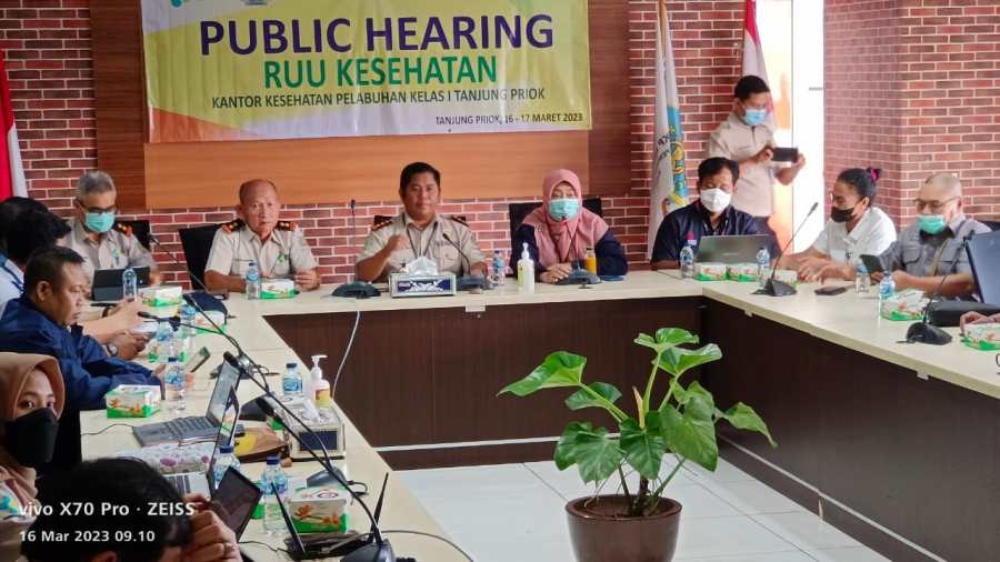Kementerian Kesehatan Cq Direktorat Jenderal Pencegahan dan Pengendalian Penyakit (P2P) melalui Kantor Kesehatan Pelabuhan ( KKP) Kelas I Tanjung Priok menyelenggarakan Rapat Dengar Pendapat (Public Hearing) secara hybrid, luring terkait RUU Kesehatan yang substansinya terkait Wabah Penyakit Menular, bertempat di Ruang Rapat Onrust KKP Kelas I Tanjung Priok, Kamis (16/3/2023).