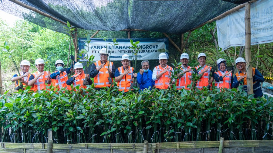 Wahyu mengatakan pihaknya bekerja sama dengan dengan Kelompok Tani Mangrove Wonorejo Surabaya dalam penataan ekosistem dan pembibitan mangrove, program ini dilaksanakan sejak September 2022 lalu. Dengan mengoptimalkan area mangrove yang berada di sisi Barat jembatan penghubung antara lapangan penumpukan dan dermaga TPS.