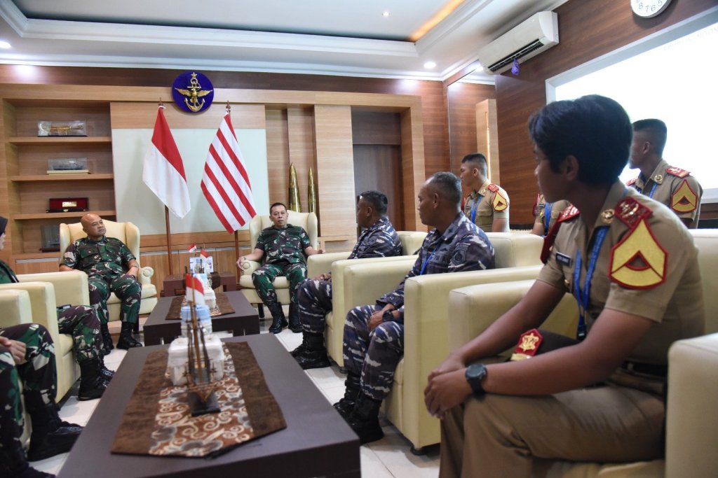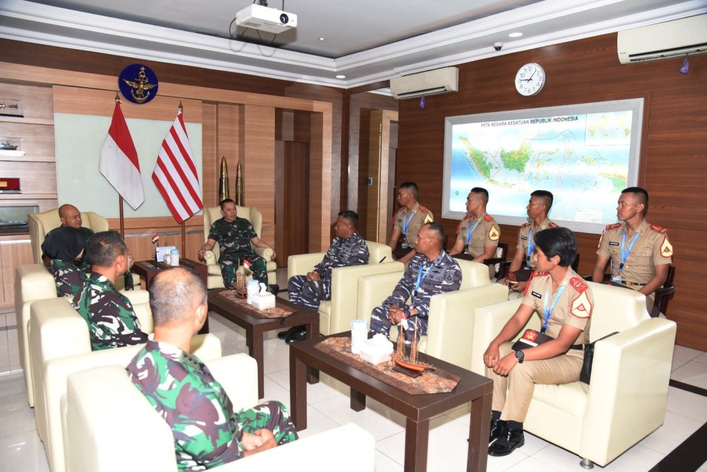 Panglima Komando Lintas Laut Militer Laksda TNI Yayan Sofiyan didampingi Kepala Staf dan Inspektur Kolinlamil serta Aspers Pangkolinlamil dan Komandan Satlinlamil 1 menerima kunjungan courtesy call Taruna AAL Angkatan ke-71 di ruang tamu Panglima Kolinlamil, Mako Kolinlamil, Tanjung Priok, Jakarta Utara, Senin (27/3/2023).