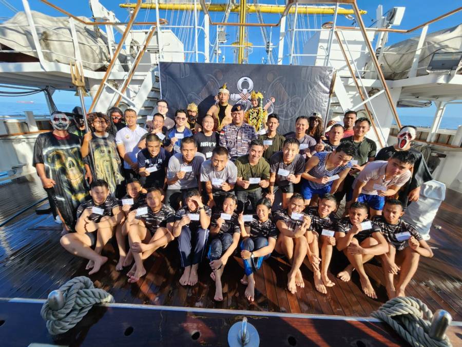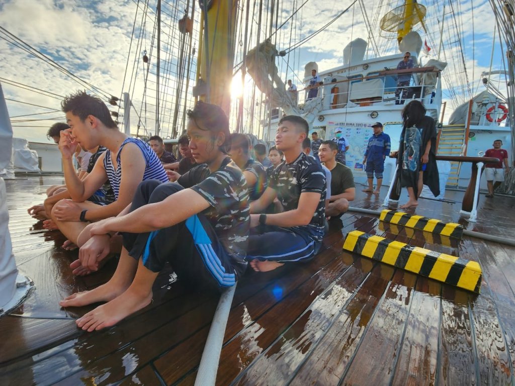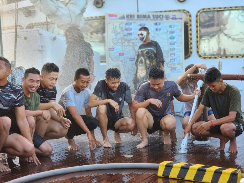 Seusai mengikuti seluruh rangkaian tradisi mandi khatulistiwa, taruna Association South East Asia Nations (ASEAN) Cadet Sail 2023 resmi menjadi warga kehormatan KRI Bima Suci di atas geladak KRI Bima Suci dalam pelayarannya menuju Batam, Selasa (4/4/2023).