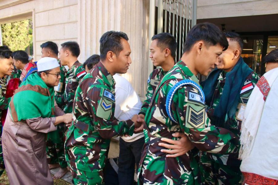 Usai melaksanakan ibadah sholat Idul Fitri 1 Syawal 1444 H di kantor Kedutaan Besar Republik Indonesia (KBRI) Beirut, para prajurit tersebut melaksanakan halal bihalal bersama keluarga secara streaming, pekan ini.