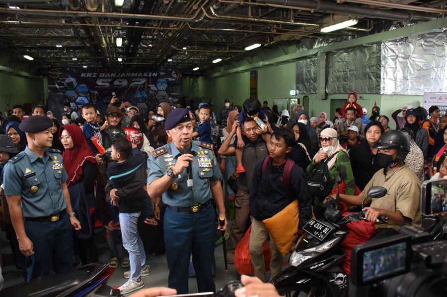 “Saya sangat bersyukur bahwa program mudik asyik naik kapal perang yang diinstruksikan oleh Kepala Staf Angkatan Laut Laksamana TNI Muhammad Ali untuk memberikan layanan gratis kepada peserta mudik Idul Fitri 1444 Hijriah sejak awal keberangkatan hingga arus balik dapat terlaksana dengan tertib, aman dan lancar. Terima kasih kepada Komandan KRI Banjarmasin-592 dan seluruh prajurit KRI yang sudah melaksanakan tugas ini dengan baik serta zero accident,” ujar Panglima Kolinlamil