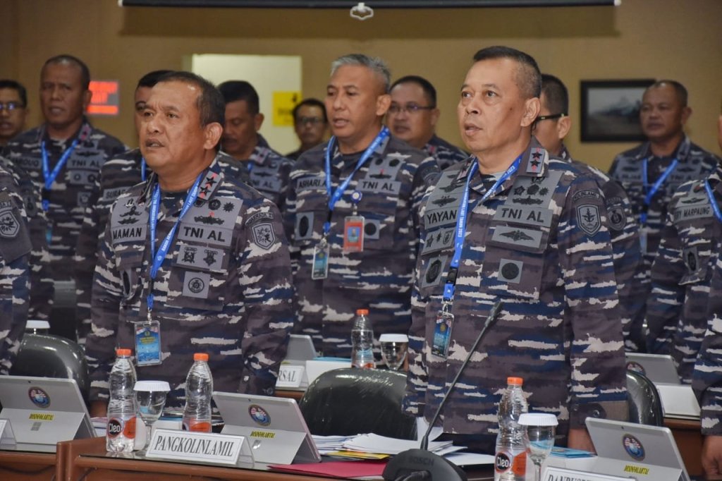 Panglima Komando Lintas Laut Militer Laksda TNI Yayan Sofiyan mengikuti kegiatan Rapat Koordinasi Perencanaan dan Keuangan (Rakor Renaku) I TNI Angkatan Laut tahun 2023 yang dilaksanakan di gedung Wispa Lanudal Juanda, Surabaya, Selasa (16/5/2023).