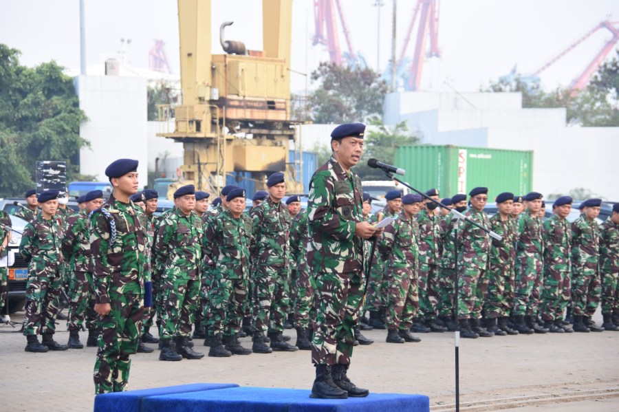 Komandan Pusat Hidro-Oseanografi TNI Angkatan Laut (Danpushidrosal) Laksamana Madya TNI Nurhidayat melepas Manuver Lapangan (Manlap) Latihan Operasi Survei dan Pemetaan Hidro-Oseanografi (Latopssurta Hidros) tahun 2023 bertempat di Dermaga Jakarta Internasional Container Terminal (JICT) II Tanjung Priok, Jakarta Utara, Kamis (25/5/2023).