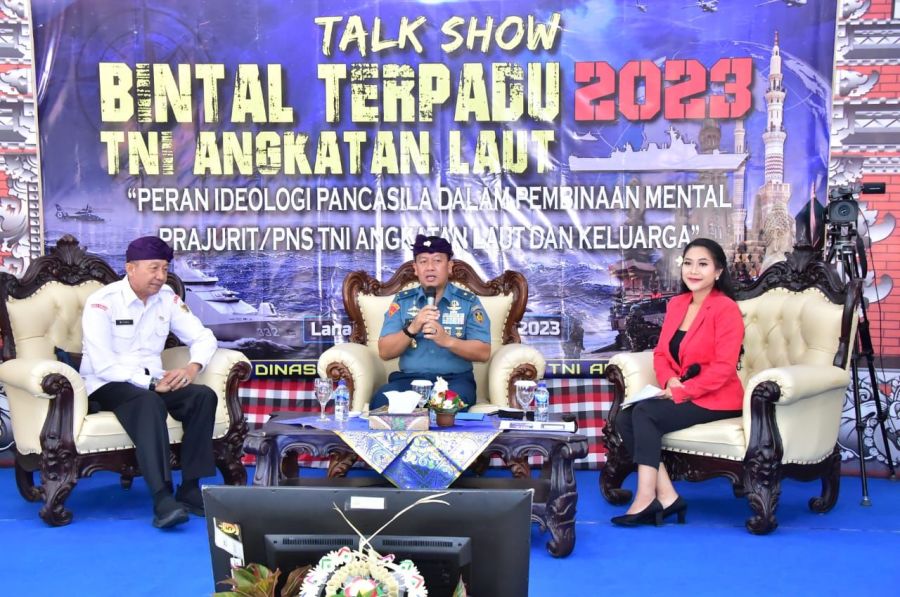 Pentingnya meningkatkan pemahaman tentang ideologi negara serta membentuk mental yang kuat dan komitmen tinggi bagi prajurit dan PNS beserta keluarganya, TNI Angkatan Laut (TNI AL) menyelenggarakan Talkshow Pembinaan Mental Terpadu Tahun 2023 di Mako Pangkalan TNI AL (Lanal) Denpasar, Bali, Senin (29/5/2023).