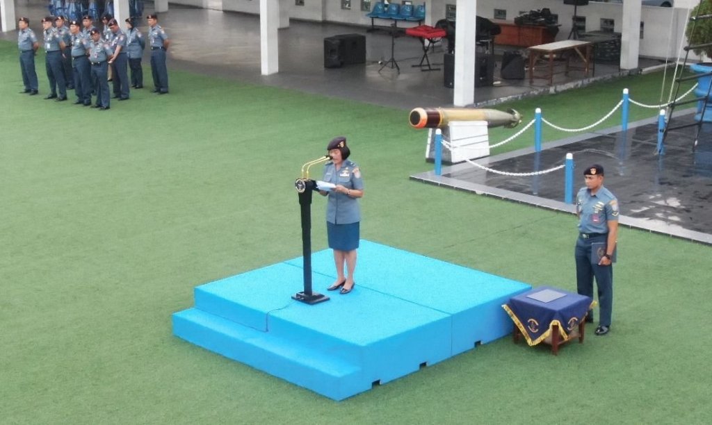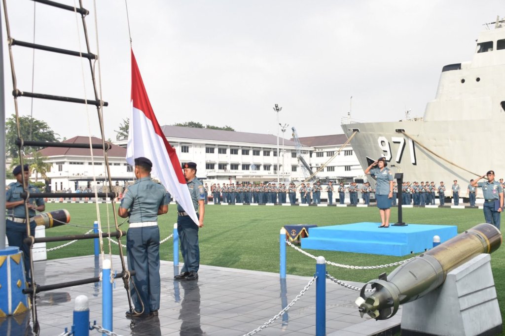 Inspektur Komando Lintas Laut Militer Laksma TNI Damayanti selaku Inspektur Upacara memimpin jalannya upacara bendera bulanan setiap tanggal 17 yang diikuti oleh seluruh prajurit dan PNS jajaran Kolinlamil di lapangan Moeljono Silam, Mako Kolinlamil, Tanjung Priok, Jakarta Utara, Senin (19/6/2023).