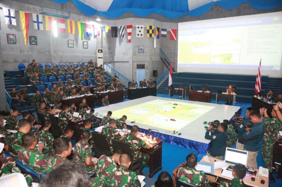 TNI AL menyelenggarakan Tactical Floor Game (TFG) Latopsfib Latihan Armada Jaya XLI Tahun 2023 yang dipimpin Pangkoarmada II Laksda TNI Maman Firmansyah bertempat di Ruang TFG Gedung Sulawesi Kodiklatal, Surabaya, Kamis (22/6/2023).