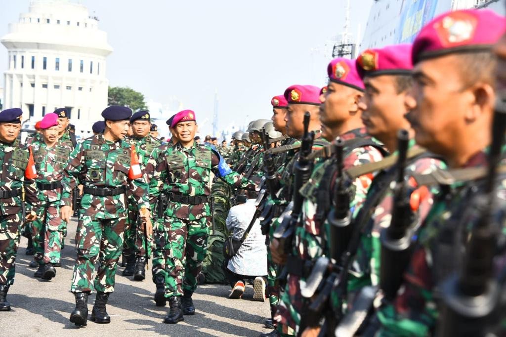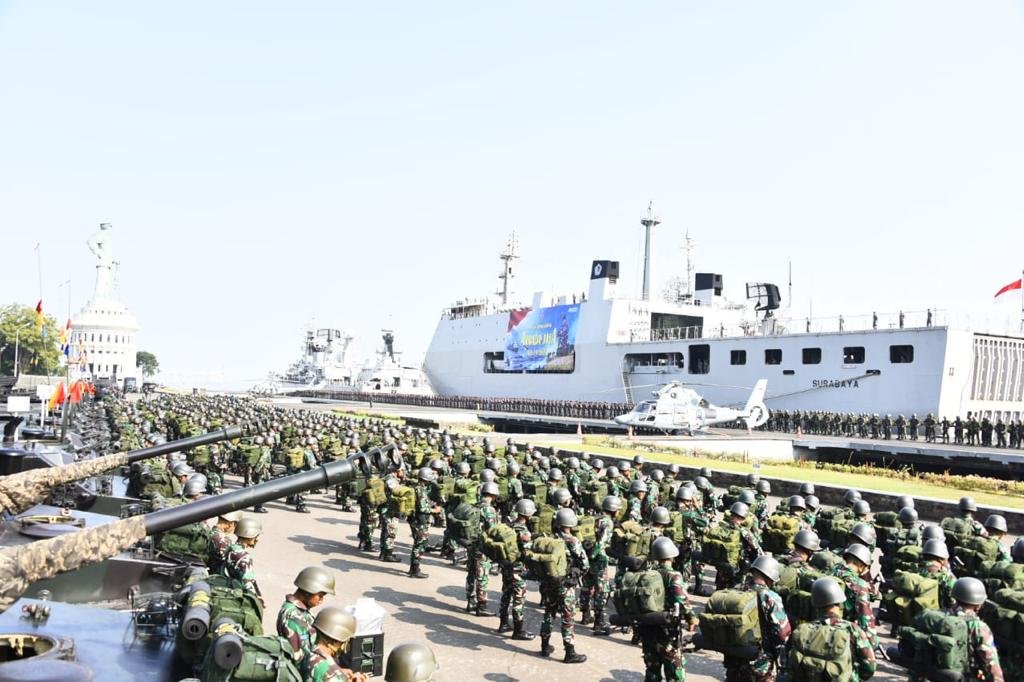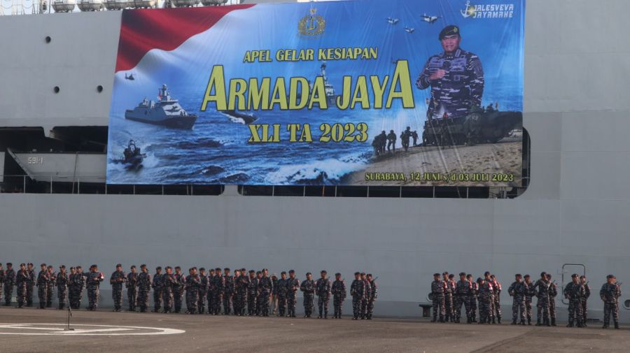 TNI Angkatan Laut (TNI AL) melaksanakan Apel Gelar Kesiapan Latihan Armada Jaya XLI tahun 2023 yang dipimpin oleh Panglima Koarmada RI Laksdya TNI Heru Kusmanto sebagai Pangkogab TNI mewakili Kepala Staf Angkatan Laut (Kasal) Laksamana TNI Muhammad Ali dalam Latihan Armada Jaya XLI tahun 2023, di Dermaga Madura Koarmada II Ujung, Surabaya, Selasa (27/6/2023).