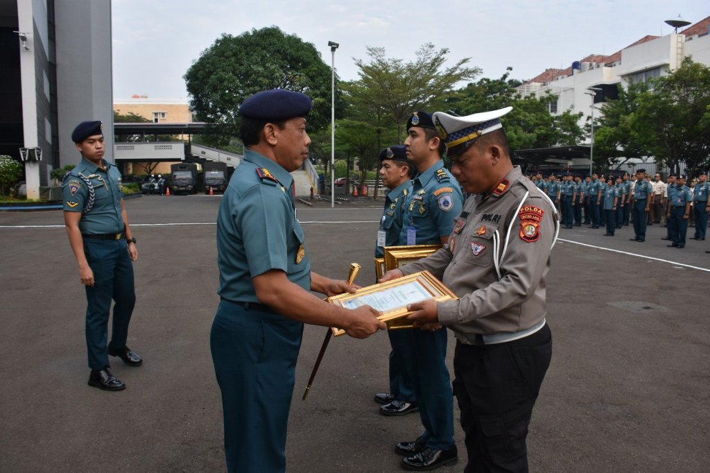 Komandan Pusat Hidro-oseanografi TNI Angkatan Laut ( Danpushidrosal) Laksamana Madya TNI Nurhidayat memberikan penghargaan kepada personel polisi yang sehari-harinya bertugas di pintu masuk kawasan kantor Pushidrosal, Ancol Jakarta Utara, hari ini Senin, (3/7/2023).
