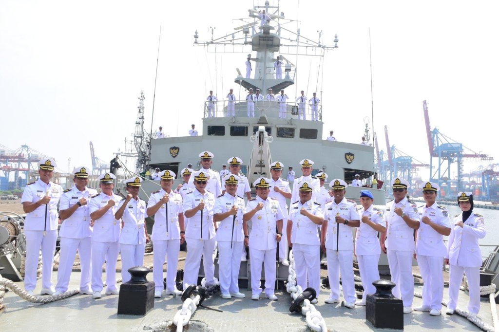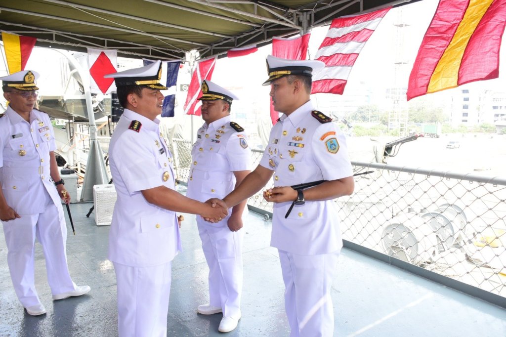 Komandan Satuan (Dansat) Survei Pushidrosal Kolonel Laut (P) B. Dwiadji Gultom memimpin acara Serah Terima Jabatan (Sertijab) Komandan KRI Dewa Kembar (DKB) – 932 bertempat di geladak KRI DKB – 932 yang bersandar di dermaga Jakarta Internasional Container Terminal (JICT) II Tanjung Priok, Jakarta Utara, Senin, (3/7/2023).