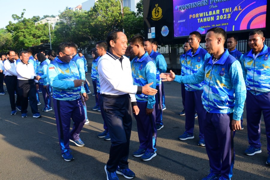 Komandan Pusat Hidro-oseanografi TNI Angkatan Laut (Danpushidrosal) Laksamana Madya TNI Nurhidayat menerima kontingen Pushidrosal selesai berlaga dalam Pekan Olahraga Wilayah Barat (Porwilbar) TNI Angkatan Laut tahun 2023 di lapangan apel Mako Pushidrosal, Jakarta Utara, Selasa, (18/7/2023).