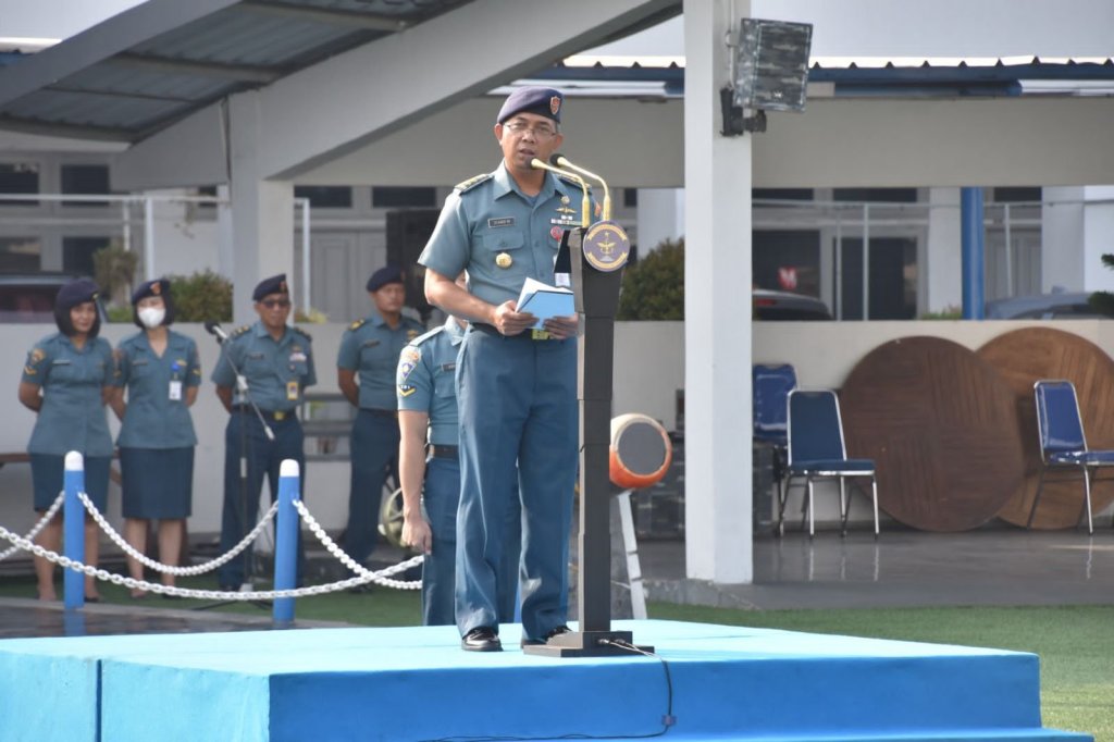 Kepala Dinas Kesehatan Komando Lintas Laut Militer Letkol Laut (K) dr. Syarif Mustika Harinurdi memimpin jalannya upacara bendera yang diikuti segenap prajurit dan PNS jajaran Kolinlamil di lapangan Moeljono Silam, Mako Kolinlamil, Tanjung Priok, Jakarta Utara, Senin (24/7/2023).