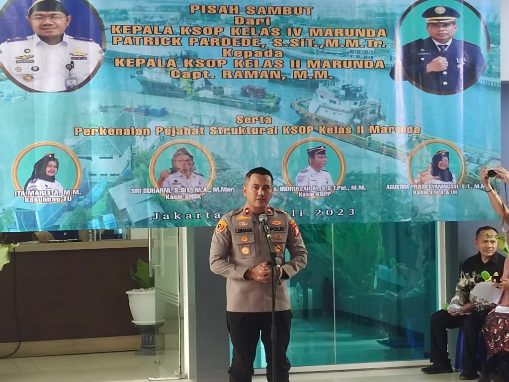 Sementara itu, Kapolres Pelabuhan Tanjung Priok yang diwakili Kapolsek Kawasan Kalibaru Kompol Immanuel Sinaga S.H., S.IK dalam sambutannya menyampaikan pesan dan kesan dari Kepolisian di wilayah hukum pesisir pantai Jakarta Utara ini, selama bertugas menjadi Kapolsek kurang lebih 7 bulan di Polres Pelabuhan Tanjung Priok sudah banyak pesan dan kesan terhadap seluruh stakeholder yang ada dikawasan pelabuhan Marunda, terutama kepada Kepala KSOP Kelas IV Marunda pejabat lama Bapak Patrick Pardede sudah seperti sohib (saudara).