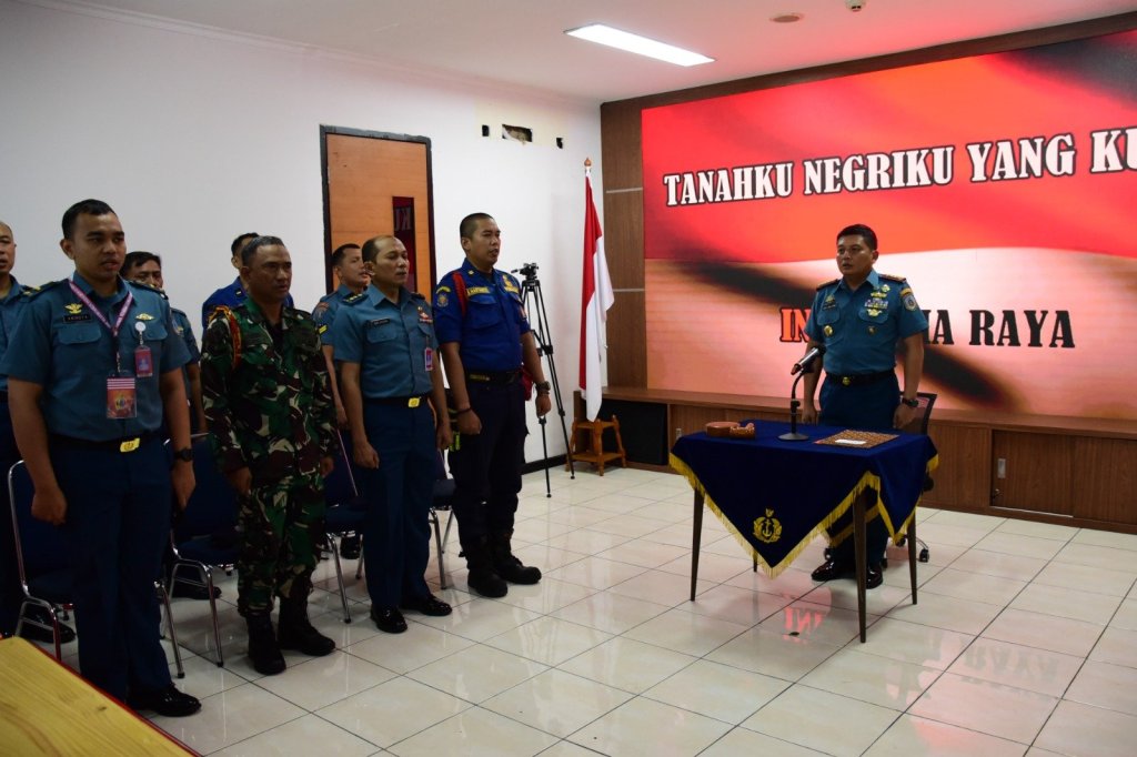 Komandan Satuan Survei (Dansatsurvei) Pushidrosal Kolonel Laut (P) B. Dwiadji Gultom menutup latihan penanggulangan bahaya kebakaran dan kebocoran TA 2023 bertempat di ruang serbaguna Satsurvei, Jakarta Utara, Senin (7/8/2023).