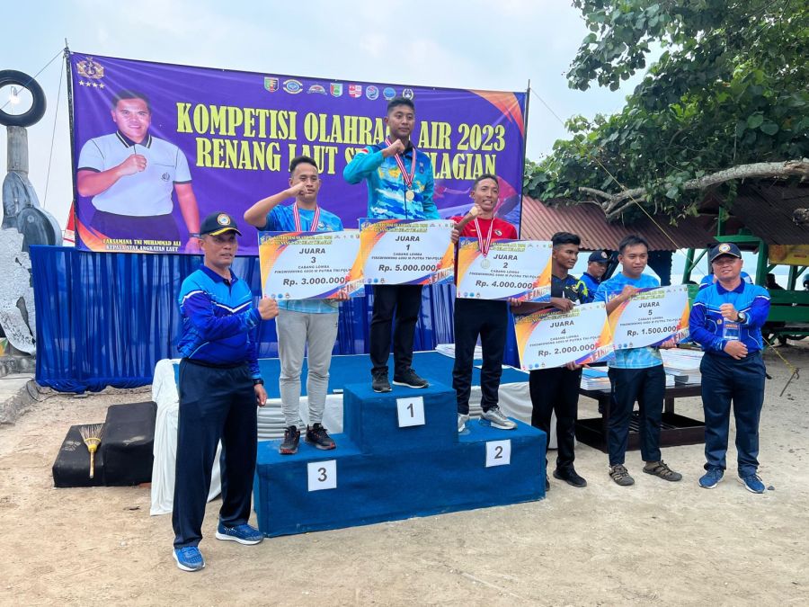 Atlet Pusat Hidro-oseanografi TNI Angkatan Laut (Pushidrosal) menjuarai kompetisi olahraga air renang laut Selat Kelagian 2023 bertempat di Pantai Kiara Pesawaran, Lampung, Kamis (10/8/2023).