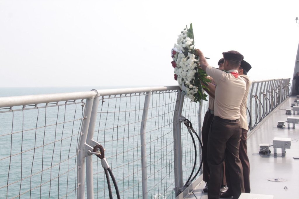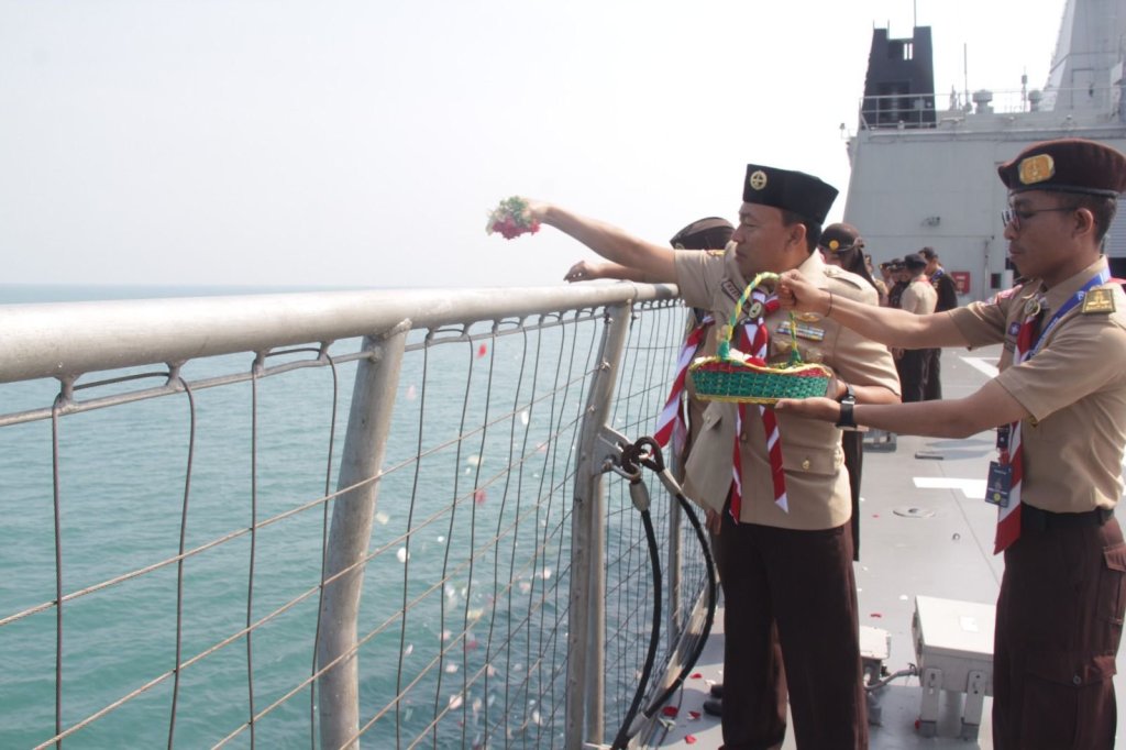 Dalam rangka memperingati Hari Pramuka ke-62 dan Reimuna Nasional XII tahun 2023 dilaksanakan upacara tabur bunga di perairan Teluk Jakarta dengan menggunakan kapal perang jajaran Komando Lintas Laut Militer yaitu KRI Banda Aceh-593, Selasa (15/8/2023).