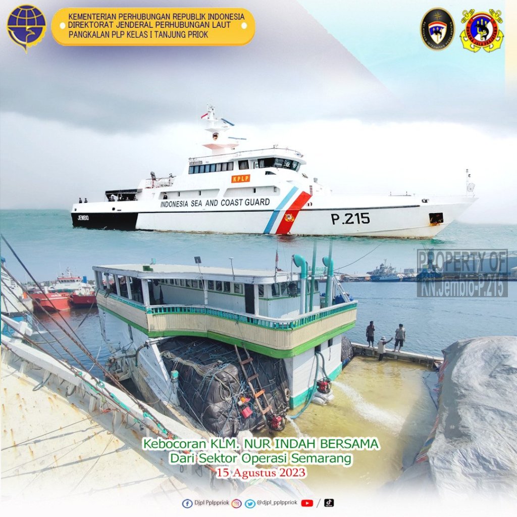 Pangkalan Penjagaan Laut dan Pantai Kelas I Tg.Priok Jakarta, Direktorat Kesatuan Penjagaan Laut dan Pantai, Direktorat Jenderal Perhubungan Laut, melalui kapal patroli KPLP KN.Jembio-P.215 pada hari Selasa (15/8/2023) Pukul 08.00 WIB berhasil menyelamatkan musibah kapal KLM.Nur Indah Bersama di Pelabuhan Semarang yang mengalami kebocoran kapal mengakibatkan ruang kamar mesin dan ruang muatan terendam air laut.