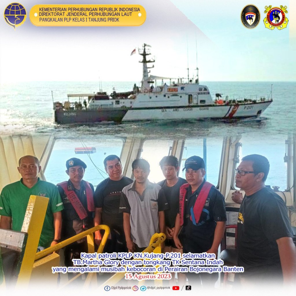 Pangkalan Penjagaan Laut dan Pantai Kelas I Tanjung Priok Jakarta, Direktorat Kesatuan Penjagaan Laut dan Pantai, Direktorat Jenderal Perhubungan Laut, melalui kapal patroli KPLP KN.Kujang-P.201 dengan Komandan Capt.Irawan pada hari Selasa (15/8/2023) Pukul 08.14 WIB berhasil menyelamatkan kapal TB Martha Glory yang menggandeng tongkang TK.Sentana Indah di Perairan Bojonegara Banten yang mengalami kebocoran pada tongkang yang membawa muatan batubara yang mengakibatkan ruang tongkang miring dan hampir tenggelam.