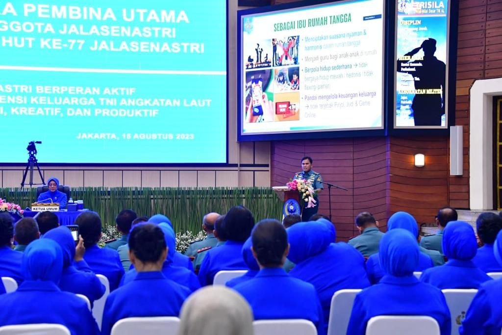 Menjelang HUT Ke-77 Jalasenastri tahun 2023, Kepala Staf Angkatan Laut (Kasal) Laksamana TNI Muhammad Ali selaku Pembina Utama menggelar Acara Tatap Muka dengan anggota Jalasenastri yang didampingi oleh Ketua Umum (Ketum) Jalasenastri Ny. Fera Muhammad Ali bertempat di Auditorium Denma Mabesal, Cilangkap, Jakarta Timur, Selasa (15/8/2023).