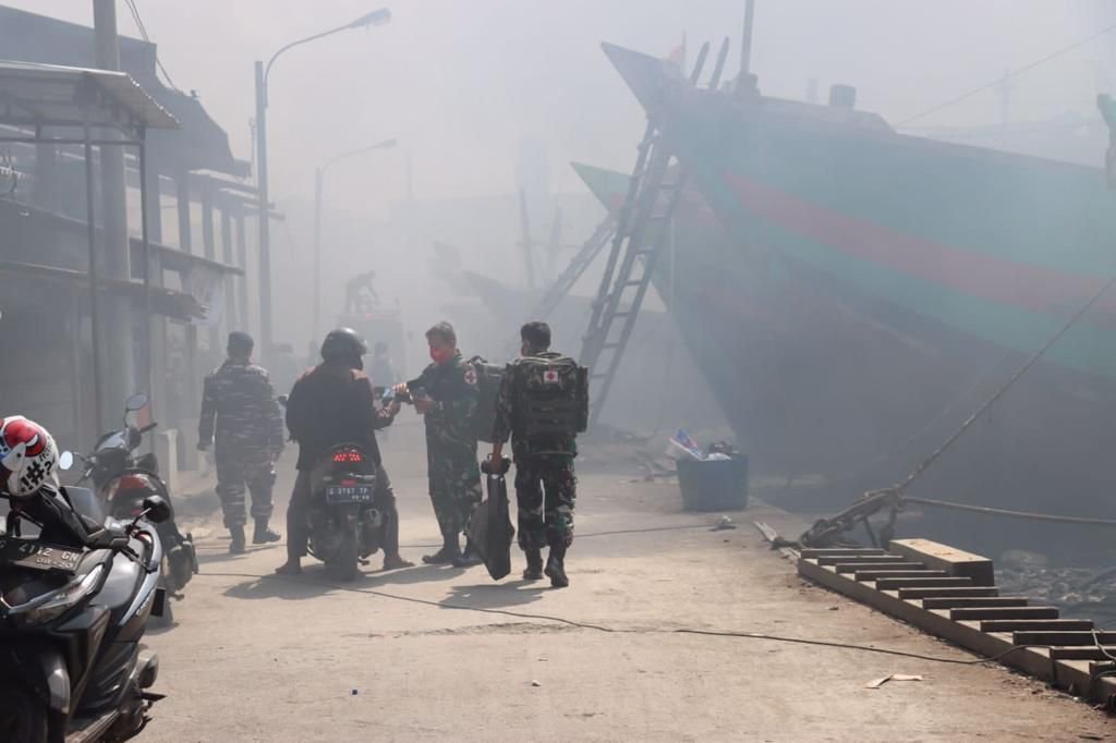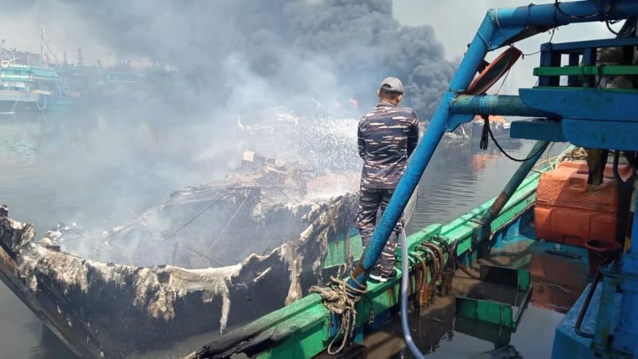 Tim Siaga Bencana Pangkalan TNI AL (Lanal) Tegal bersama Polresta Tegal, Damkar Kota Tegal dan masyarakat membantu dalam upaya pemadaman api kebakaran kapal nelayan di Pelabuhan Jongor Tegalsari, Kota Tegal, Senin (14/8/2023).