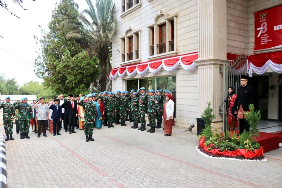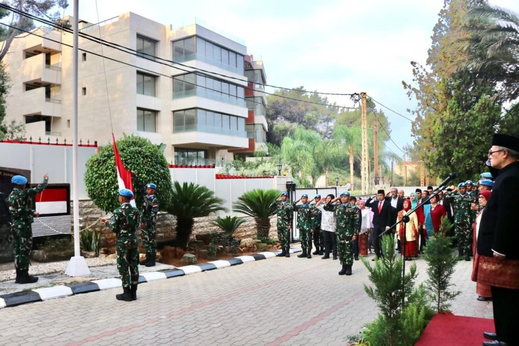 Jauh dari tanah air, tidak menyurutkan semangat Satgas MTF TNI Konga XXVIII-N/ UNIFIL untuk merayakan HUT Kemerdekaan RI ke-78. Pelaksanaan upacara bendera dalam rangka memperingati HUT Kemerdekaan RI ke-78 yang dipimpin oleh Duta Besar LBBP RI untuk Lebanon, Drs. Hadjriyanto Y. Thohari, M.A. berlangsung di halaman Kantor KBRI Beirut, Kamis (17/8/2023) lalu.