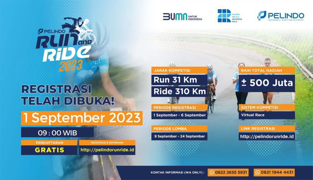 Bersiaplah! ajang tahunan kompetisi virtual race ‘Pelindo Run and Ride’ yang diinisiasi PT Pelabuhan Indonesia (Persero) atau Pelindo segera digelar tanggal 9 September – 24 September 2023.