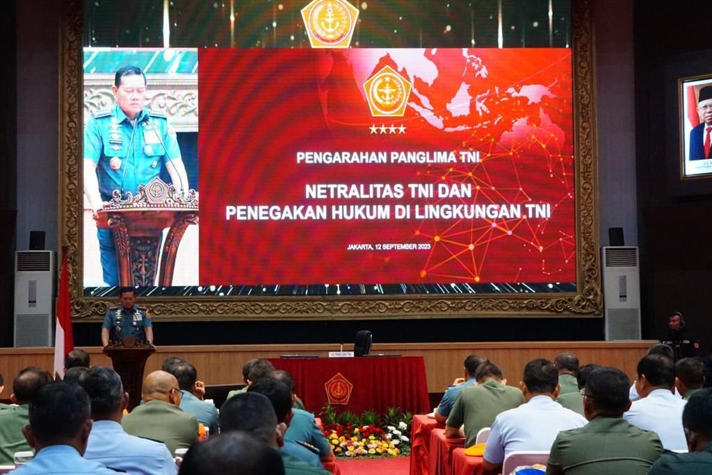 Jelang Pemilihan Umum (Pemilu) serentak yang akan dilaksanakan 2024 mendatang menjadi perhatian yang besar bagi TNI dalam menjaga netralitasnya. Berkaitan dengan hal tersebut, Panglima TNI Laksamana TNI Yudo Margono berkesempatan untuk memberikan pengarahan kepada jajaran TNI yang berlangsung di Aula Gatot Subroto Denma Mabes TNI, Cilangkap, Jakarta Timur, Selasa (12/9/2023).