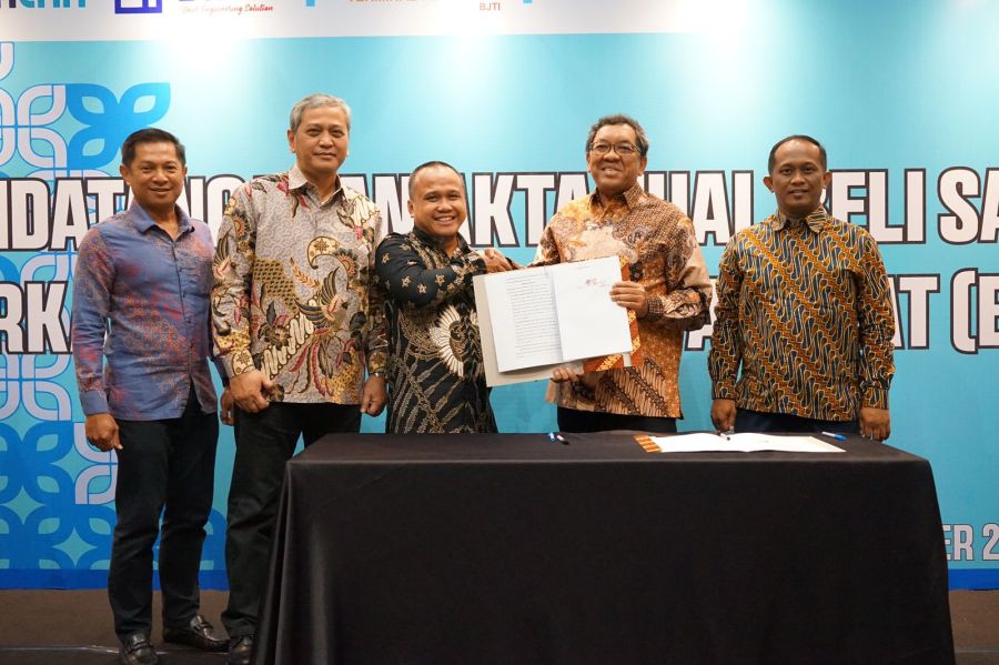 Direktur Utama PT Pelindo Jasa Maritim, Prasetyadi bersama Plt. Direktur Utama PT Berlian Jasa Terminal Indonesia, Sarjono menandatangani perjanjian perikatan jual beli tersebut disaksikan oleh perwakilan PT Pelabuhan Indonesia (Persero), Fahrus Salam selaku Group Head Manajemen Portofolio Anak Perusahaan Pelindo.