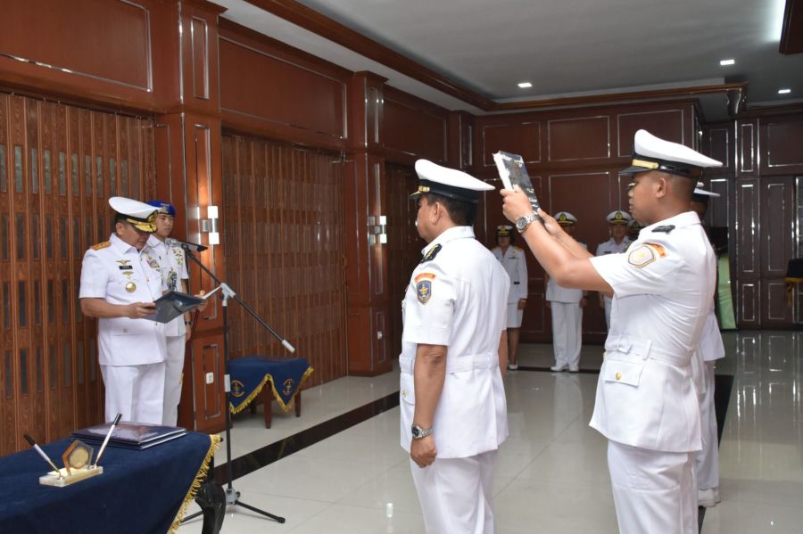 Panglima Komando Lintas Laut Militer Laksda TNI Edwin, S.H., M.Han. M.H. memimpin jalannya serah terima dan penyerahan jabatan di lingkungan Kolinlamil yang berlangsung di Gedung Laut Nusantara, Mako Kolinlamil, Tanjung Priok, Jakarta Utara, hari ini, Rabu (18/10/2023).