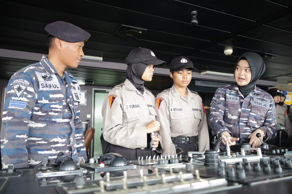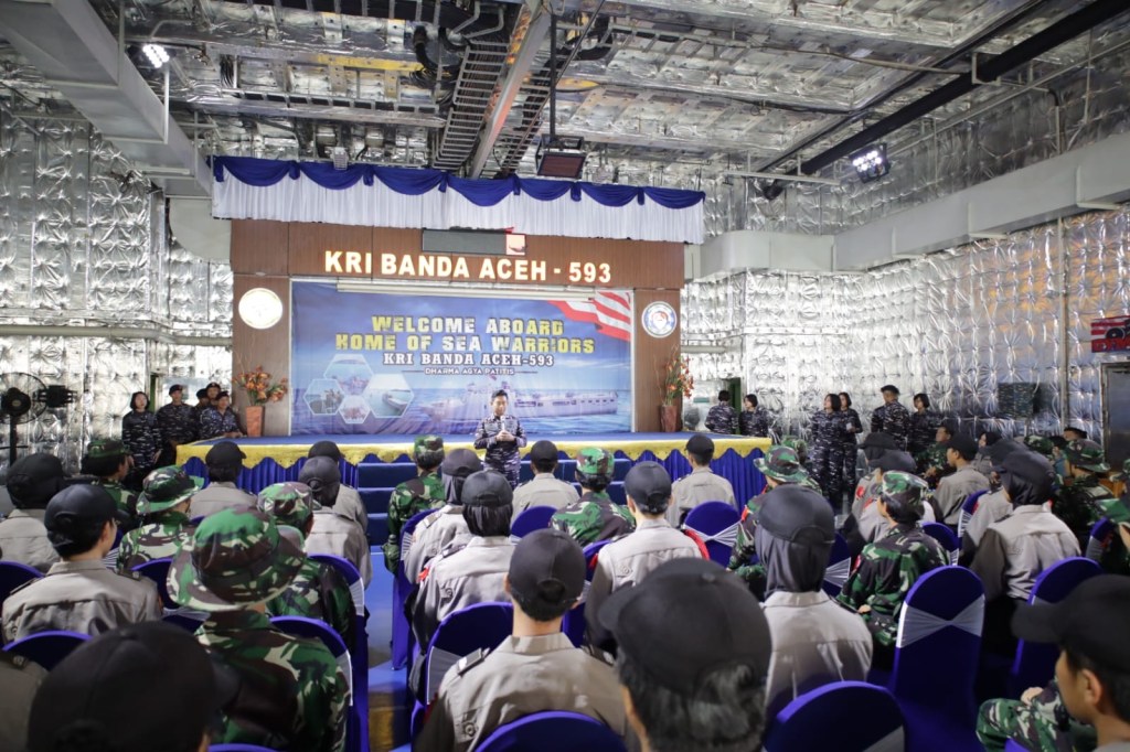 Dalam rangka penyelenggaraan kegiatan terintegrasi Pendidikan Pembentukan TNI dan Polri serta menambah wawasan mengenai TNI AL, 56 siswa Pendidikan Pembentukan (diktuk) TNI dan Polri terdiri dari 40 siswa Sepolwan Ciputat, 8 siswa Puslatdiksarmil TNI AL dan 8 siswa Pusdik AU Kaliurang Yogyakarta mengunjungi KRI Banda Aceh-593 yang tengah sandar di dermaga Mako Kolinlamil, Tanjung Priok, Jakarta Utara, Selasa (24/10). Sebelum naik KRI, rombongan yang dipimpin oleh Kompol Teti Yunita diterima dan disambut oleh Asisten Potensi Maritim Kolinlamil Kolonel Laut (P) Teguh Imam Wibowo dalam hal ini mewakili Panglima Kolinlamil Laksda TNI Edwin, S.H., M.Han., S.H. didampingi Kepala Dinas Administrasi Personel Kolonel Laut (KH/W) Angesti Udiati selaku Perwira Tertua (Pater) Kowal Kolinlamil beserta sejumlah Perwira Kolinlamil lainnya.