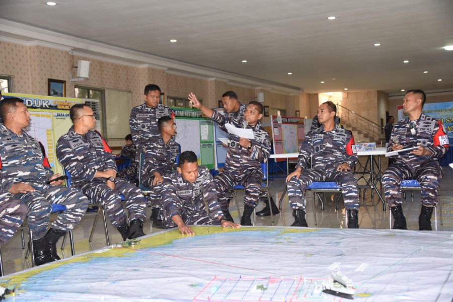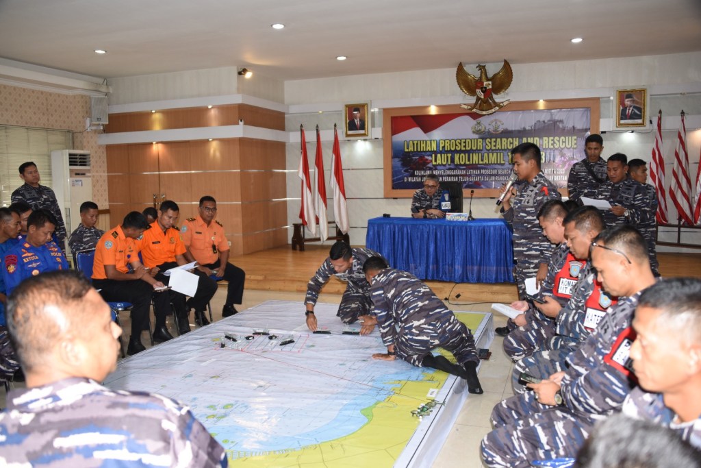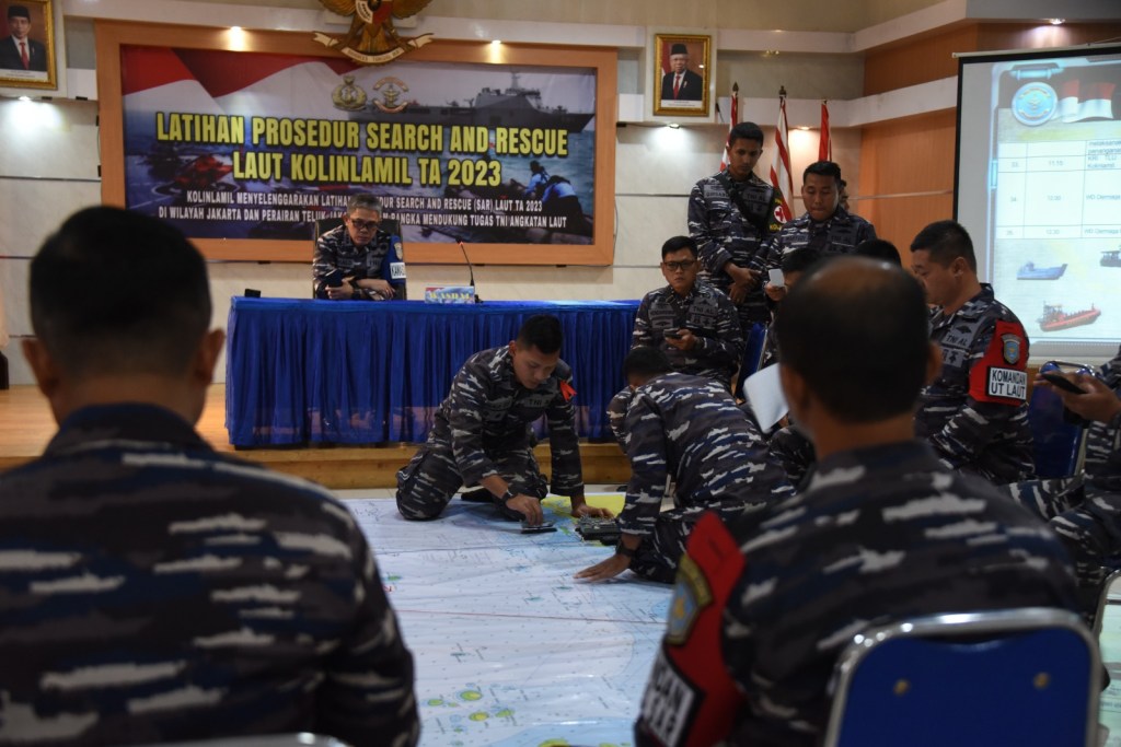 Jelang pelaksanan Manuver Lapangan (manlap) pada Latihan Prosedur Search and Rescue (SAR) Laut Kolinlamil tahun 2023, Komandan Satuan Lintas Laut Militer 1 Kolonel Laut (P) Yohanes Upang Komandan Satuan Tugas SAR Kolinlami tahun 2023 memimpin pelaksanaan kegiatan Tactical Floor Game (TFG) yang berlangsung di gedung Laut Natuna, Mako Kolinlamil, Tanjung Priok, Jakarta Utara, Selasa (24/10)/2023).