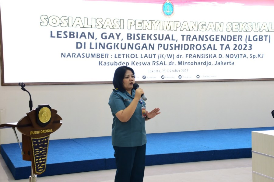 Pusat Hidro-Oseanografi TNI Angkatan Laut (Pushidrosal) mengadakan sosialisasi tentang penyimpangan LGBT di lingkungan Pushidrosal bertempat di ruang serbaguna Pushidrosal, Jakarta Utara, Rabu (25/10/2023).