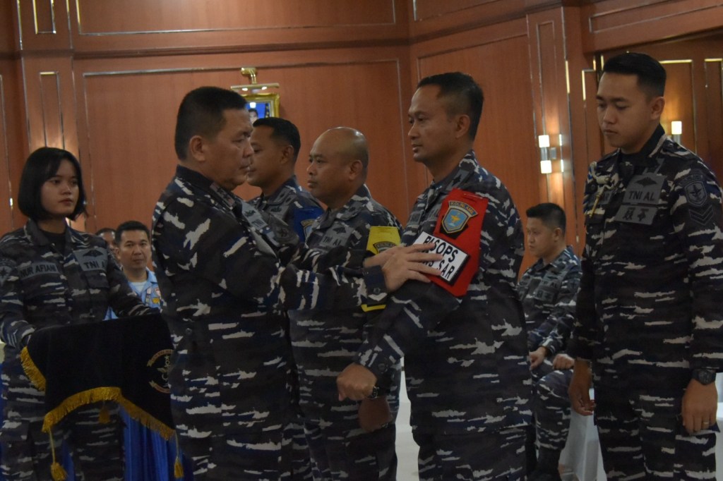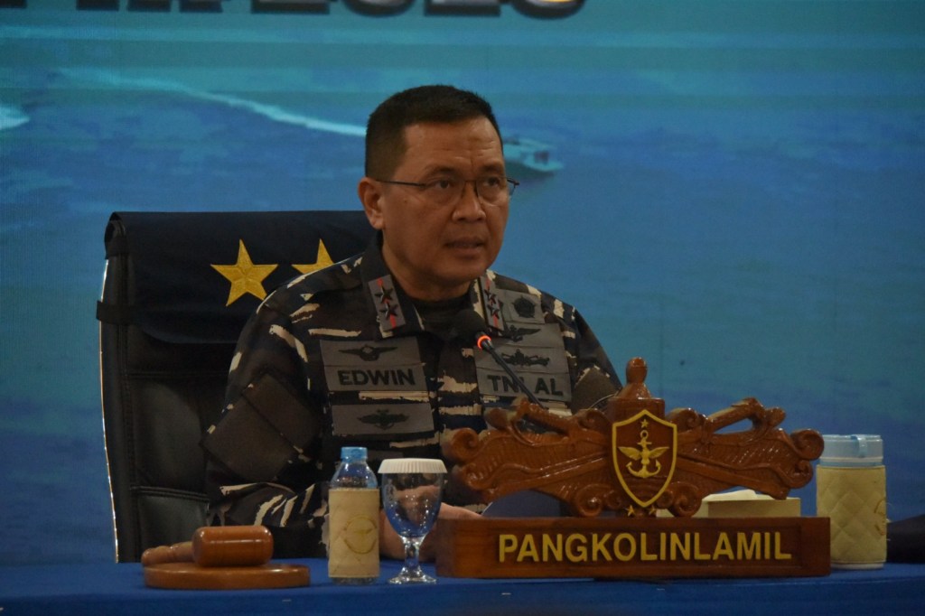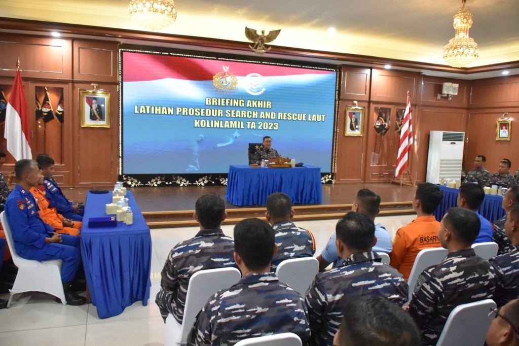 Panglima Komando Lintas Laut Militer Laksda TNI Edwin S.H., M.Han., M.H selaku Direktur Latihan menyampaikan briefing akhirnya sebagai tanda berakhirnya seluruh rangkaian kegiatan Latihan Prosedur Search and Rescue Laut tahun 2023 yang berlangsung di Gedung Laut Nusantara, Mako Kolinlamil, Tanjung Priok, Jakarta Utara, Jumat (27/10/2023).