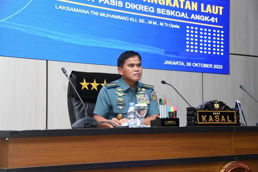 Hal ini disampaikan Kepala Staf TNI Angkatan Laut (Kasal) Laksamana TNI Muhammad Ali saat memberikan Pembekalan Kepada Perwira Siswa (Pasis) Pendidikan Reguler (Dikreg) Sekolah Staf dan Komando Angkatan Laut (Seskoal) Angkatan Ke-61 T.A. 2023, bertempat di Gedung Amphiteater Samadikun, Markas Komando (Mako) Seskoal, Kebayoran Lama, Cipulir, Jakarta Selatan, Senin (30/10/2023).