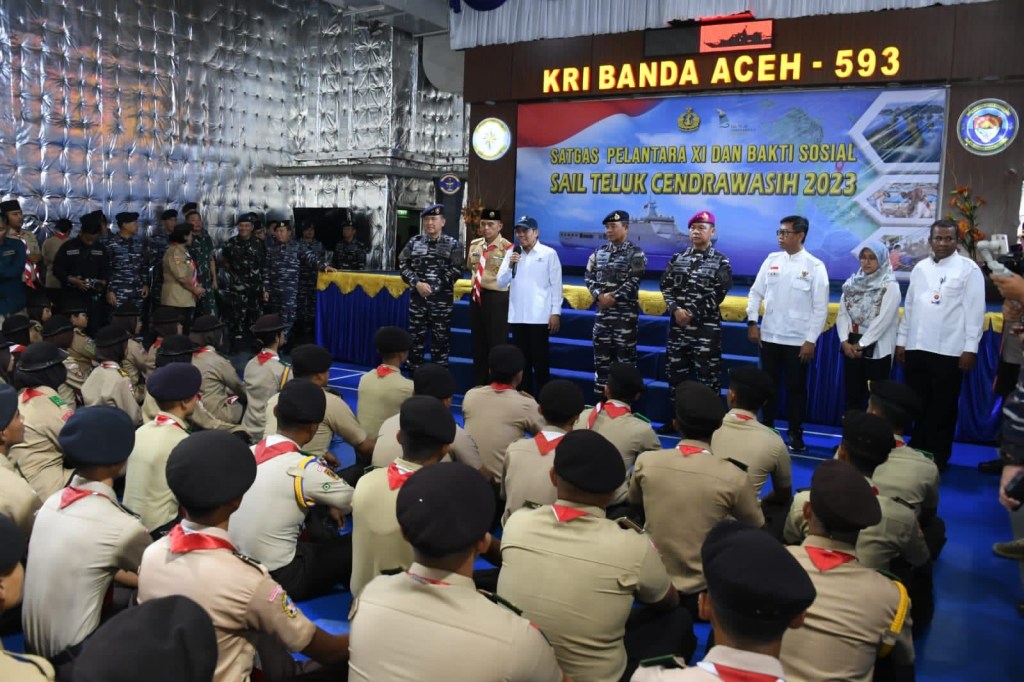 Dalam rangka pembinaan dan pembentukan National Character Building generasi muda bangsa sebagai calon pemimpin masa depan, TNI Angkatan Laut (TNI AL) memberangkatkan KRI Banda Aceh-593 dalam Upacara Pelepasan Satuan Tugas (Satgas) Pelayaran Lingkar Nusantara XI (Pelantara XI) dan Bakti Sosial Sail Teluk Cenderawasih 2023 (STC-2023) yang dipimpin oleh Deputi Bidang Promosi Penanaman Modal, Kementerian Investasi / BKPM, Nurul Ichwan, di lapangan M. Silam, Mako Kolinlamil, Jakarta Utara, Kamis (09/11/2023)