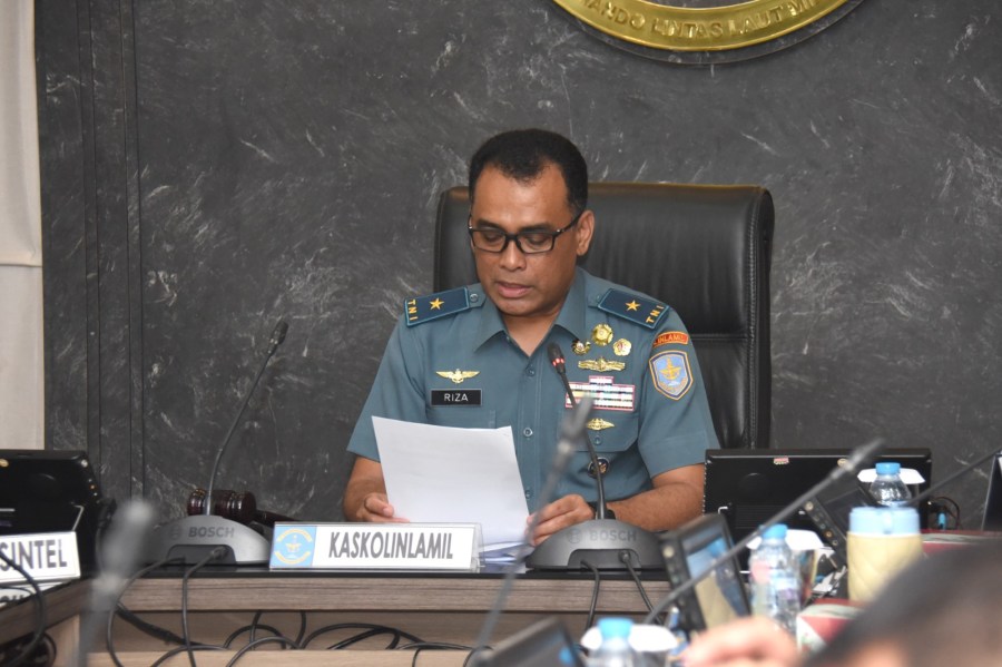 Kepala Staf Kolinlamil Laksma TNI Mochammad Riza, S.E., M.Tr Opsla., CRMP memimpin sidang intern pengendalian karir (dalkar) dan usulan kenaikan pangkat (UKP) kala waktu 1 April 2024 yang berlangsung di ruang rapat Panglima Kolinlamil, Mako Kolinlamil, Tanjung Priok, Jakarta Utara, Senin (13/11/2023).