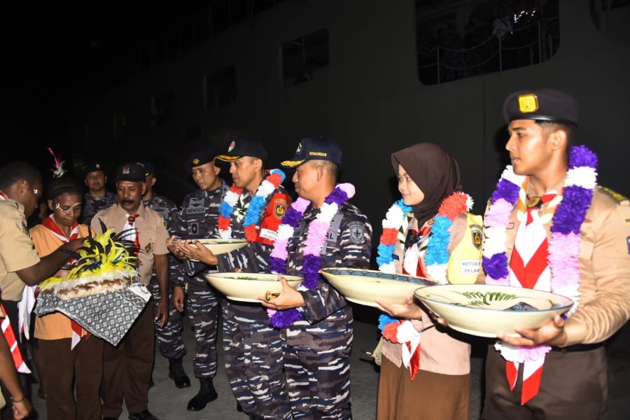 Setelah menempuh perjalananan pelayaran kurang lebih 10 hari menggunakan KRI Banda Aceh-593, para peserta Pelantara XI yang bertujuan mensukseskan Sail Cendrawasih 2023, langsung disambut hangat oleh Pramuka Saka Bahari Lanal Biak Numfor