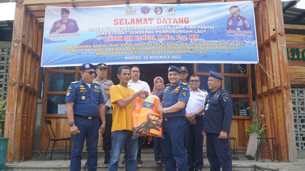 Masih dalam rangkaian Rakernis KPLP, Direktorat Kesatuan Penjagaan Laut dan Pantai terus berkomitmen untuk memenuhi aspek keselamatan pelayaran dengan melakukan Sosialisasi Peralatan Keselamatan Pelayaran, Rabu (22/11). Pada kesempatan tersebut, Direktur KPLP, Jon Kenedi memberikan secara langsung bantuan 300 buah Life Jacket kepada asosiasi/pengusaha kecil pelayaran rakyat di Kabupaten Pesisir Selatan Sumatera Barat, untuk menurunkan angka kecelakaan kapal di laut terutama yang disebabkan karena faktor manusia.