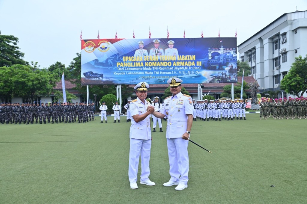 Panglima Koarmada Republik Indonesia (Pangkoarmada RI) Laksamana Madya TNI Heru Kusmanto, memimpin upacara serah terima jabatan Jabatan Panglima Komando Armada III (Pangkoarmada III) yang diserah terimakan dari Laksamana Muda TNI Rachmad Jayadi kepada Laksamana Muda TNI Hersan di lapangan Arafuru, Mako Koarmada RI, Jakarta Pusat, Senin (27/11/2023).