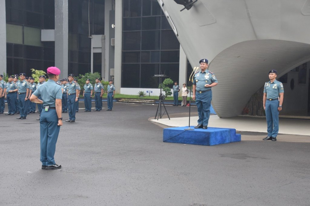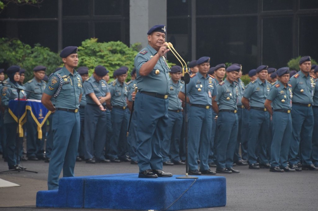 Komandan Pusat Hidro-Oseanografi TNI Angkatan Laut (Danpushidrosal) Laksamana Muda TNI Budi Purwanto memimpin apel khusus yang diikuti oleh seluruh personel jajaran Pushidrosal di Mako Pushidrosal, Jakarta Utara, Senin (4/12/2023).