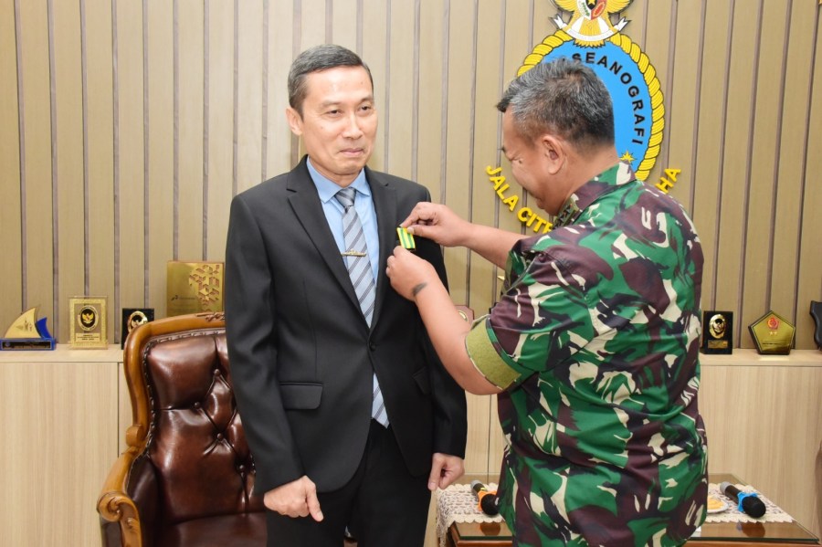 Komandan Pusat Hidro-Oseanografi TNI Angkatan Laut (Danpushidrosal) Laksamana Madya TNI Budi Purwanto menyematkan tanda kehormatan Satyalancana Dwidya Sistha kepada Prof. DR. Henry Manik.