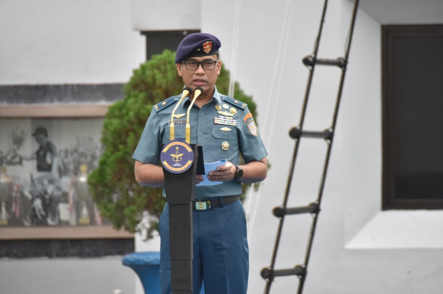 Kepala Staf Kolinlamil Laksma TNI Mochammad Riza, S.E., M.Tr Opsla, CRMP memimpin upacara penaikan bendera jajaran Komando Lintas Laut Militer yang berlangsung di lapangan Moeljono Silam, Mako Kolinlamil, Tanjung Priok, Jakarta Utara, Senin (8/1/2023).