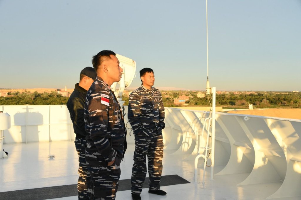 Satuan Tugas (Satgas) Port Visit Mesir 2024 yang tengah menjalankan misi kemanusiaan pengiriman bantuan dari masyarakat Indonesia untuk korban konflik di Gaza menggunakan KRI dr. Radjiman Wedyodiningrat-992 (KRI RJW-992), saat ini tengah melintasi Terusan Suez, Senin (12/2/2024).