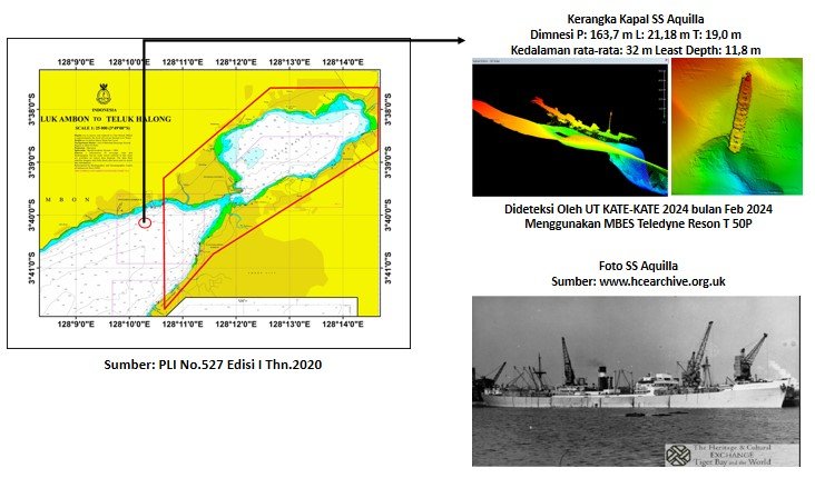 Kerangka kapal baru yang terdeteksi di sekitar Perairan Dermaga Pertamina Ambon pada kedalaman 32 m dan least depth 11,8 m. Dimensi kerangka kapal menurut data MBES adalah panjang 163,7 m lebar 21,8 m dan tinggi 19 m. Berdasarkan hasil wawancara dari penyelam lokal, kerangka tersebut adalah SS Aquilla yang tenggelam pada tahun 1958. Selain itu, UT Kate-Kate juga berhasil mendeteksi kerangka kapal terbang yang ada di Teluk Halong pada kedalaman perairan 26 m.
