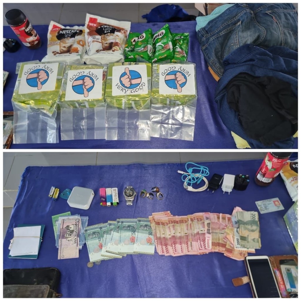 Selanjutnya terduga pelaku berinisial IS, 47 tahun, asal Jawa Timur beserta barang bukti antara lain 4 kantong narkoba diduga jenis Sabu dengan berat sekitar ± 4 kg, uang tunai senilai Rp. 5,8 juta, Ringgit sebanyak 316 RM 20 Sen, KTP dan Paspor atas nama terduga pelaku dan 1 buah sampan ditarik menuju Dermaga Panton Tanjung Balai.