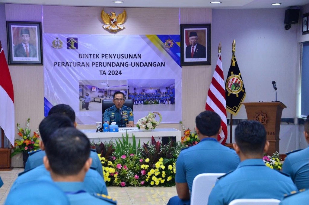 Sebagai upaya pembinaan personel TNI AL terhadap pengembangan kemampuan dan keterampilan di bidang perundang-undangan dan hukum, TNI Angkatan Laut (TNI AL) dalam hal ini Dinas Hukum TNI Angkatan Laut (Diskumal) menggelar Pembinaan Teknis (Bintek) Penyusunan Peraturan Perundang-Undangan Tahun 2024 yang dibuka secara langsung oleh Kepala Dinas Hukum TNI Angkatan Laut (Kadiskumal) Laksamana Pertama TNI Leonard Marpaung bertempat di Ruang Rapat (Rupat) Diskumal, Gedung B4 Mabesal Cilangkap, Jakarta Timur, Senin (4/3/2024).