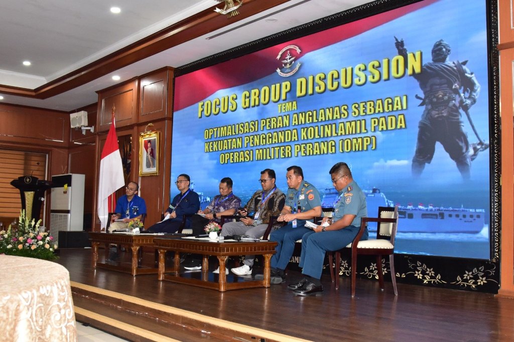 Focus Group Discussion (FGD) bertajuk “Optimalisasi Peran Anglanas Sebagai Kekuatan Pengganda Kolinlamil Pada Operasi Militer Perang (OMP)” dengan menghadirkan beberapa narasumber diantaranya, Paban II/Orstra Sops Mabes TNI Kolonel Laut (P) Donny Suharto, S.H., M.Tr.Opsla Vice President Of HSE dari PT ASDP Indonesia Ferry (Persero) Capt Syamsul Bachri, S.E. M.M, Director of Fleet Management Pertamina M. Irfan Zainul Fikri, Executive Director PT Pelabuhan Indonesia (Persero) Regional 2 Drajat Sulastyo dan Vice President Teknik Budi Hardiansyah yang dipandu moderator Dansatlinlamil III Kolonel Laut (P) Nur Rochmad., I., S.T., M.Tr.Hanla., M.Si., M.M.