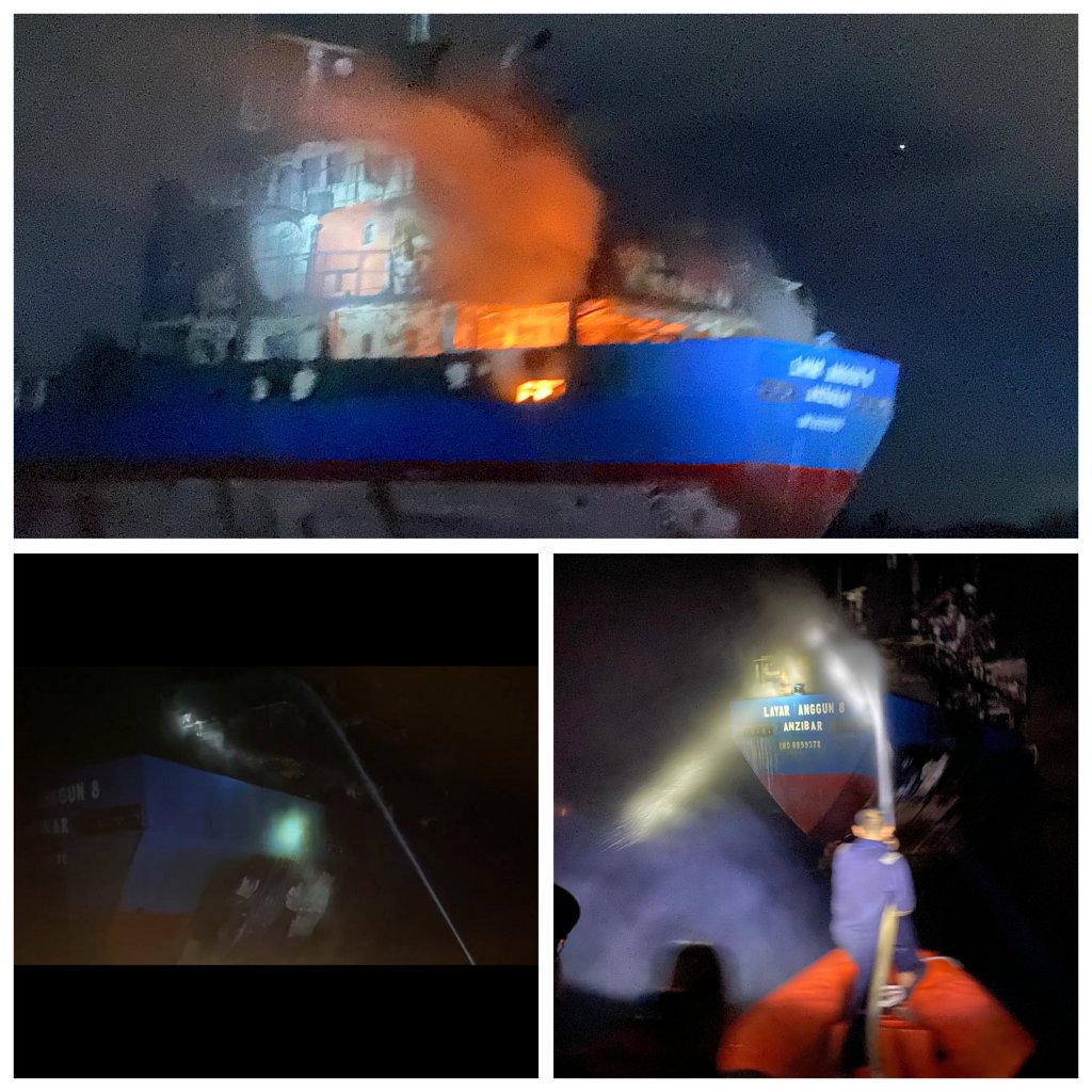 Kapal MV.LAYAR ANGGUN 8 yang mengalami kebakaran pada GPS 01 14′ 617″ N/104 30′ 050 E seputaran Perairan Tanjung Berakit Kabupaten Bangka Tengah – Bangka Belitung, pukul 15.18 WIB, pada hari Selasa, (16 /4/2024) kemarin.