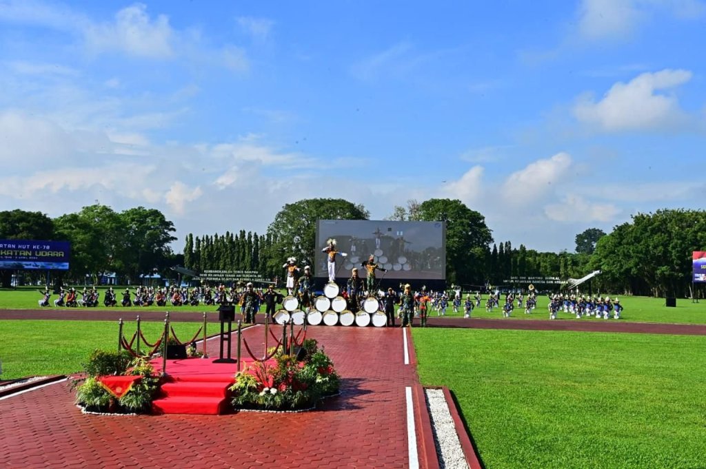 Perayaan puncak HUT ke-78 TNI AU dimeriahkan dengan penampilan demo udara berupa flypast pesawat kebanggaan TNI AU mulai dari Grob G-120 TP, KT 1B Wong Bee, C 130J Super Hercules, T-50i Golden Eagle dan juga aksi Bomb Burst dari F-16 Fighting Falcon, serta display Drumband Gita Dirgantara.(Red-MM).