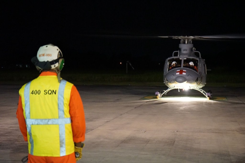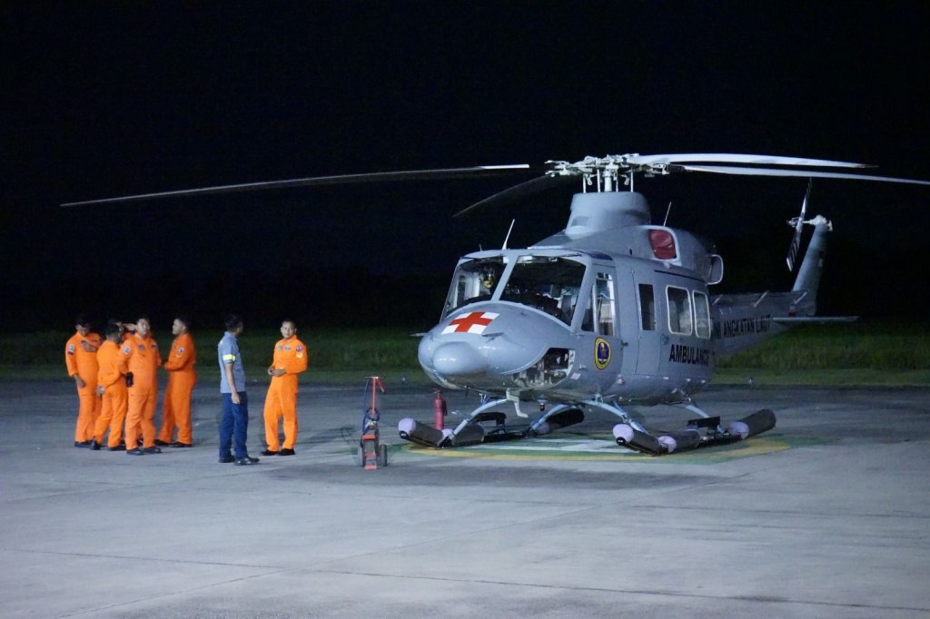 TNI Angkatan Laut (TNI AL) dalam hal ini Skuadron Udara 400 Wing Udara 2 Puspenerbal yang merupakan salah satu Skuadron Operasional di bawah Pusat Penerbangan TNI Angkatan Laut (Puspenerbal) melaksanakan latihan terbang di malam hari, dengan menggunakan Helikopter Bell 412 di area latihan sekitar Banjar Kemuning, Sidoarjo, Selasa (23/4/2024)